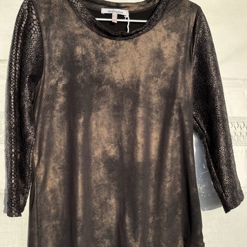 Flerfarget, mixed fabric, tynn, sheer, langermet t-skjorte med gråsvartmelert ullmix i rygg og ermer og silky, oliven/armygrønn front. Svart, eyelash, blondekant i sidene og på skuldren Grå ribb i halsen. 70% akryl, 30% ull + 100% viskose.