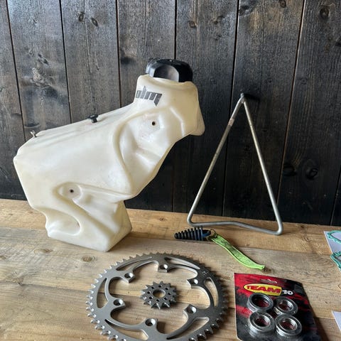 Dette var den første vannavkjølte 125 fra Yamaha å jeg tror det var i 81 jeg kjøpte den ny. Fjør, 2 bakdrev, eiker (mangler noen) hendel,slange,pakninger å vaier er nytt. Tror framdrev bortsett fra det ene er til sykkelen.