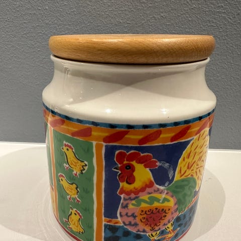 Kjøkkenutstyr dekorasjon pynt kjøkken krukke porselen keramikk pyntekrukke blank dekor pyntegjenstand styling interiør krukke kvalitet trend retro vintage dekorativ borddekorasjon bordpynt mønster farger hvit cupcake figur lid grønn gul oransje blå oppbevaring oppbevaringskrukke fargerik frukt vår