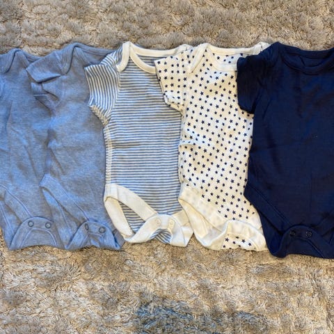 Pakke med kortarma bodyer i størrelse 0-3 mnd. Lite brukt, men kan forekomme flekker etter oppbevaring