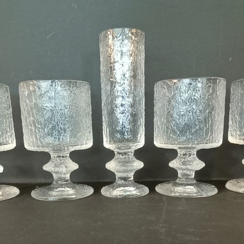 Iittala Kekkerit glass design Timo Sarpaneva. Består av 5 snaps glass, diameter ca 5, høyde ca 7. Pris samlet. PS! De store glassene er solgt.