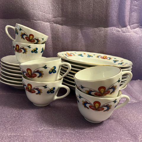 2 stk. middagsasjetter. Mål: Ø24cm. Litt bruksslitasje, og gullslitasje. Ingen slitasje på mønsteret. Ingen nagg, sprekker eller krakelering. Selges for kr.100 pr.stk.+ frakt.