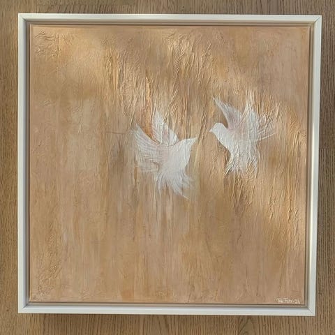 Maleri med collage / decoupage i størrelse 40x40cm på deep edge lerret laget av meg. Tittel "Vandrer videre" av elefanter og savanne. 🌸 Gult oransje og svart. Bare ta kontakt angående sending.