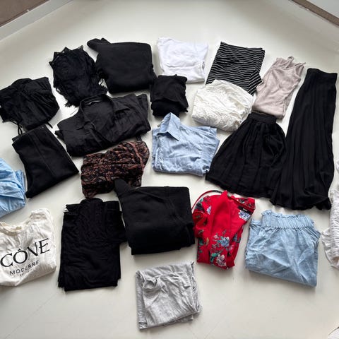 Mange fine plagg. Bukser, piratbukser, shortser, topper, gensere, skjørt, tynn jakke fra Miami. Mange av klærne er fra utlandet.