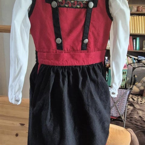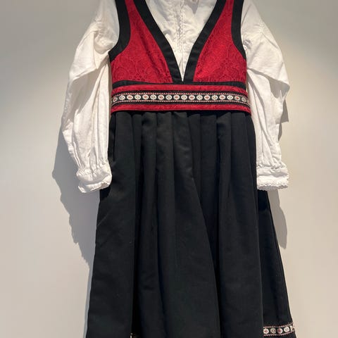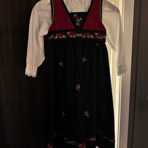 Festdrakt i str 116 selges. Mangler knapp i buksa, fremstår ellers som hel og pen. Sender ikke.