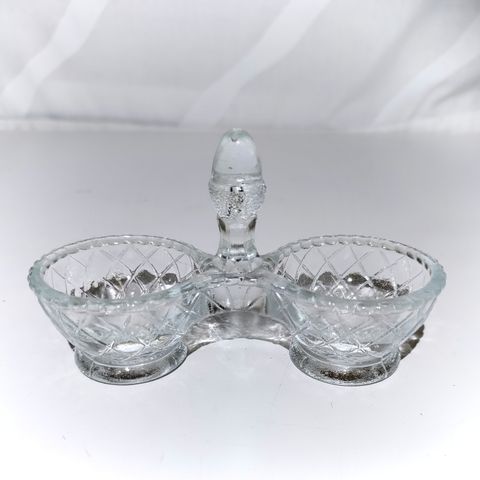 To fine gamle saltkar til bordet i pressglass. De er ca 5,5cm høye og 8,5cm på det bredeste. Pris er samlet.
