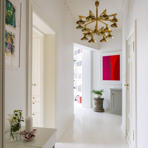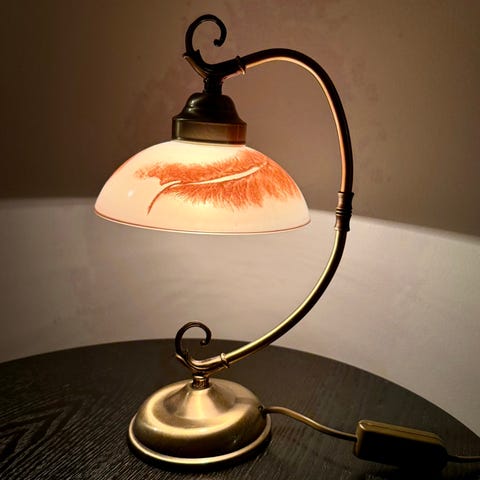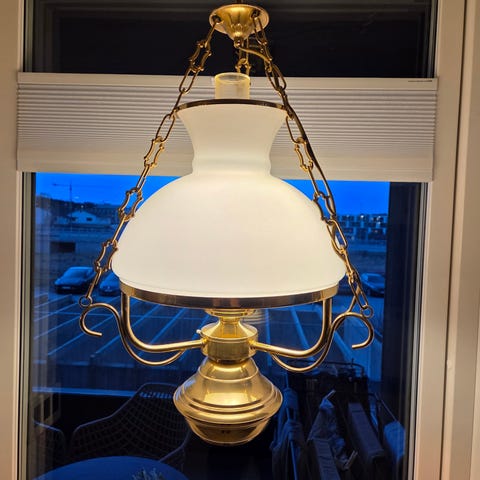 Flott lampe i messing og farget glass. I riktig god stand for alder. 60,70-tallet.