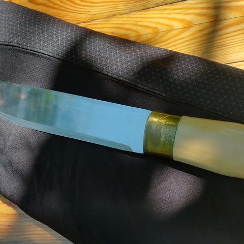 Nye kniver laget av meg. Olav Bysveen har smidd 3 lags blad. Den store kniven måler totalt 33 cm. Bladet er 15 cm. Den minste måler totalt 25 cm. Bladet er 9 cm. Den største ønsker jeg kr 6850 og den minste kr 5450. Det er livstidsgaranti og fornøyd garanti på mine kniver.
