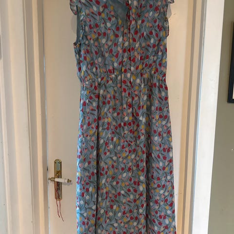 Pent brukt. Hvit med sommerblomster. Glidelås i siden, lommer og knyting i livet.