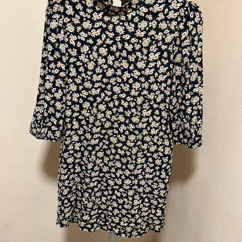 Selger en lite brukt mørkeblå kjole med blondeermer fra Object.
