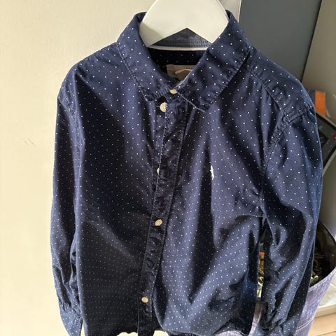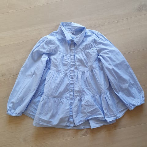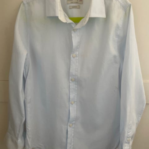 Herlig lys blå bomullsskjorte str 140 (9-10 år) fra Zara. Kan brettes opp med liten hempe og knapp på armen.