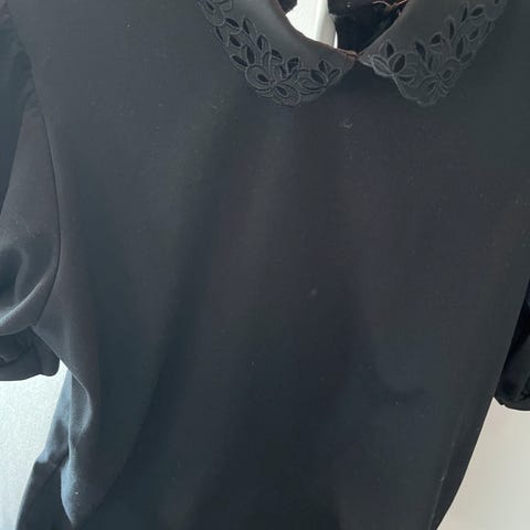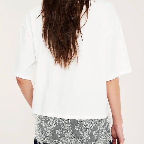 Flott grå t-skjorte med hvit «blonder» øverst. I bomull og polyester. Fra XLNT by KappAhl - tidligere kolleksjon, ikke lenger tilgjengelig i butikk eller på nett.