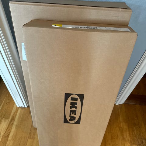Ubrukt flatpakket Hörda-hylle fra IKEA i hvit.