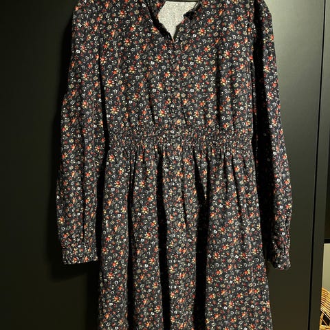 Kjole kjøpt på gjenbruksbutikk i Hamburg. Har ingen lapper, så vet ikke hvilket merke det opprinnelig er. Akkurat litt for stram til meg som er en L. Strikk i livet, men også små hemper på sidene for å kunne feste et belte.