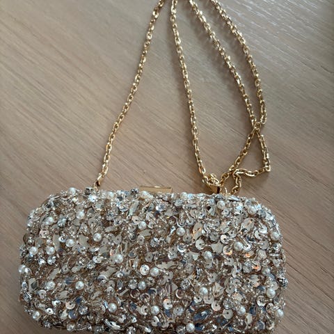 Rosa selskapsveske med glitrende «stener». Både kort og lang gullfarget rem/kjede samt ekstra «stener» følger med.