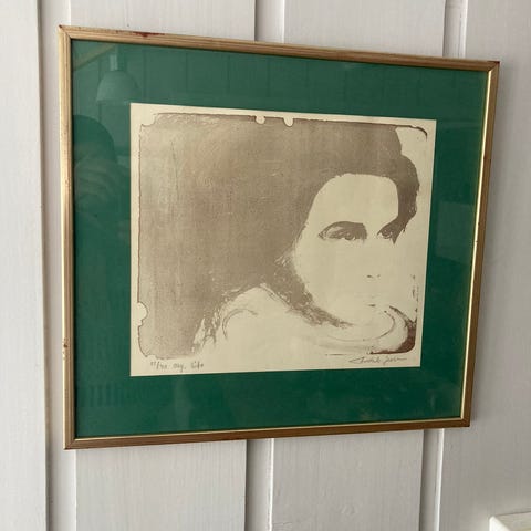 Jeg er usikker på hva slags trykk det er, men det er nummerert og signert. Motivet måler ca 59,5 x 40,5 cm. Med ramme er målene ca 77 x 56 cm. Glasset er knust og bildet må derfor innrammes på nytt/glass skiftes ut.