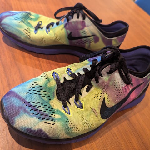Svært pent brukte treningssko fra Nike. De var dessverre litt små for meg. Jeg har brukt de maks 10 ganger. Sorte med gult leopardmønster.