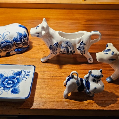 Den ene er merket «made in china» under. Vet ikke hvor gamle disse er. Kanskje fra 70-tallet? I fin stand med tanke på alder. Det som er av anmerkninger, ser ut til å være fra produksjon. Litt «slurvete» glasert noen steder. Litt malingsrester under. Se bildene.