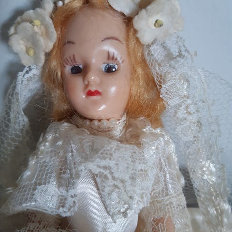 This lovely Bridal Doll was given to me when my older sister got married - over 65 years ago. The doll was treasured by me, and was treated as such, so she is still in wedding-ready condition. The only “repair” was replacing an inner elastic for the legs which was done by a Dollmaker Master, Gro K. Hansen.