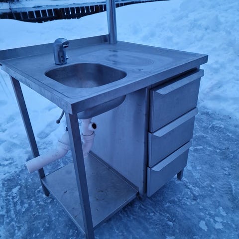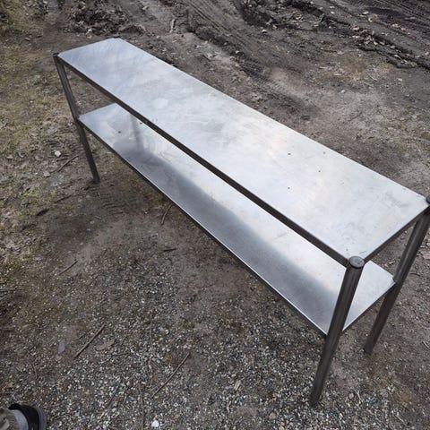 Serveringsbenk i rustfritt stål med massiv ask benkeplater. med låsbare jul.