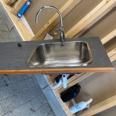 Gammel vask med utslagsvask helt perfekt til utekjøkken i Hagen eller på bryggen.