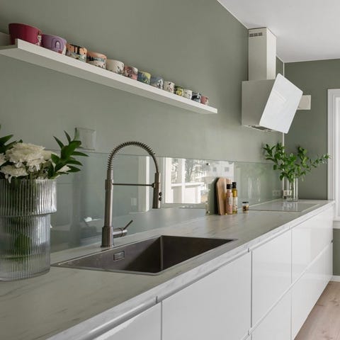 Glassplater på vegg , montert bak vask og steketoppen.