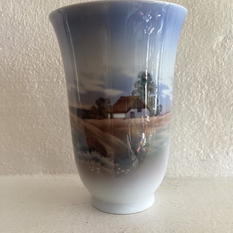 Selger et blått fat fra Porsgrund Porselen som er merket med NRF