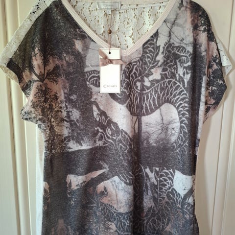 Toppen er stilig m transparent mønster foran og har fine detaljer. Toppen er pent brukt.