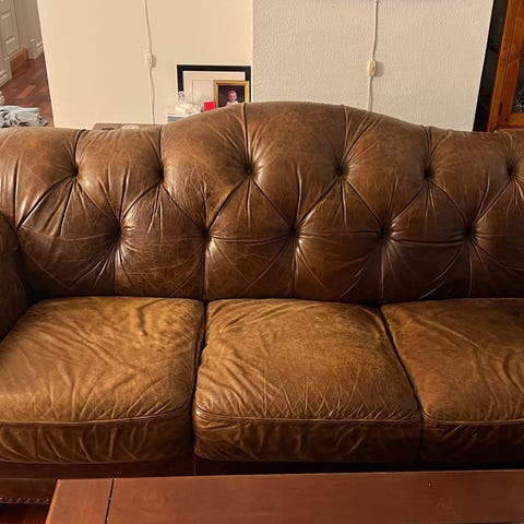 Veldig fin 3 seter skinnsofa med puff i bra stand. Behagelig å site i. Lengde på sofaen er 230 høyde 82 dyp 90.