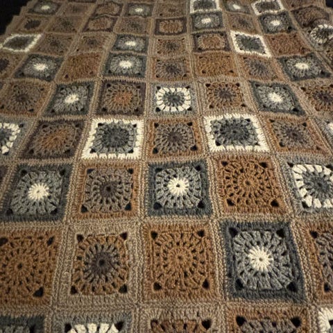 Størrelse ca 190 x 190 cm, men kan selvsagt hekles i valgfri størrelse, og valgfritt garn.