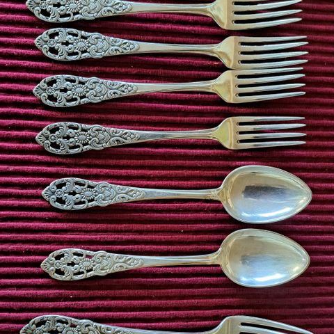 6 skjeer a ca 18,5 cm merket Grand sølvplett 40. Den ene ble ikke med på bilde. Selges for kr 150.