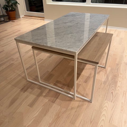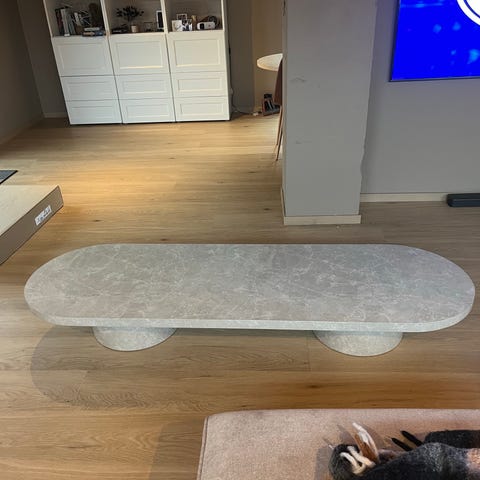 Vurderer å selge vårt flotte solide marmorbord av høy kvalitet som kan brukes til salongbord/ stuebord. Marmor er et naturmateriale og platen er dermed unik i sitt mønster.