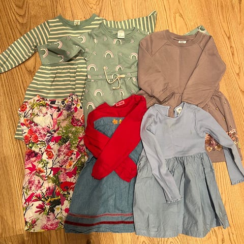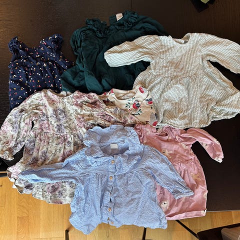 Klespakke str 74. 2 stk body , 3 kortermet kjoler, 1 langermet kjole og en bukse. Merker fra Lindex , Wheat, KappAhl og name it. ingen flekker eller hull.