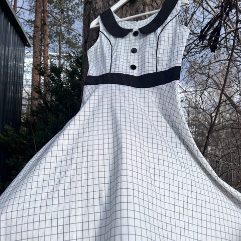 Retro / rockabilly kjole i satengstoff selges, da jeg aldri har brukt den. Har fortsatt merkelappen på (bomkjøp). Null stretch. Merket bomull/spandex, føles som polyester eller lignende. Sort base, hvite detaljer med polka dots. Nærmest bryterrygg i fasongen. God vidde i skjørtet. Glidelås i siden. Merket str L, men er nok mer en M. Veldig søt kjole, perfekt på fest med en petticoat under!