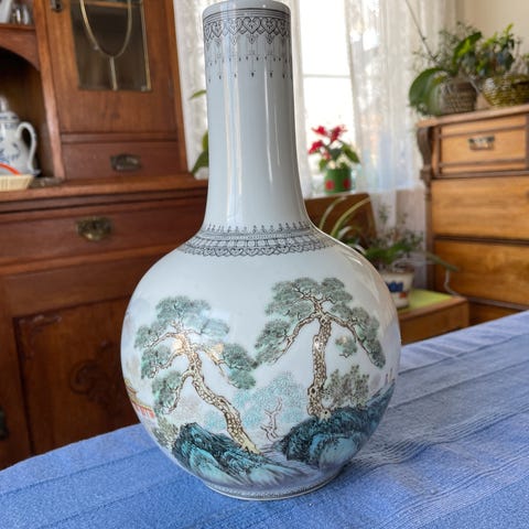 Selger et nydelig eksemplar av en håndmalt kinesisk Quianlong Nian Zhi vase med Påfugl. Flott tilstand - ingen bruksmerker. Vintage!