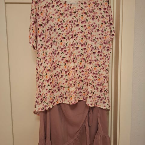 Kjolen under er svart med folder nederst, veldig lett å ha på