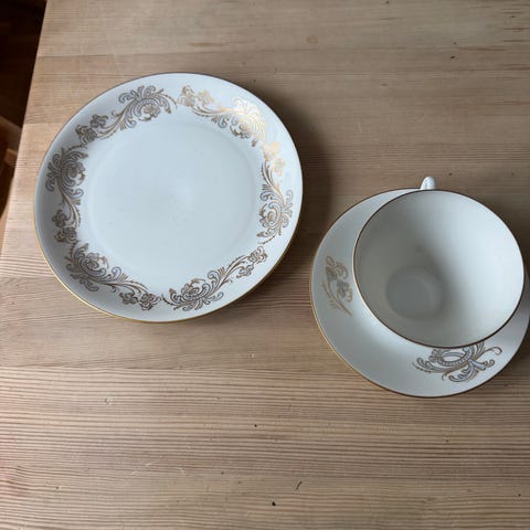 Kaffesett i 12 deler. Tysk porselen. Ikke noe bruksmerker. Tallerk 18cm, tefat 14 cm. 1 stk sukkerskål og 1 stk fløtekanne. Merket er königl.pr.Tettau germany. Selges komplett