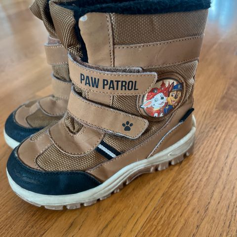Vintersko i str 24. Brukt til og fra barnehagen en liten sesong . Er ikkje vanntett , bare vannavstøtende . Har nylig blitt vaska , og dessverre for figuren Paw Patroll bort .