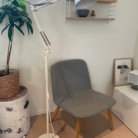 Stilren grå bordlampe fra Bolia. Ubrukt. Skjermen og beina kan du vri til slik du vil den skal stå. 58cm høy.