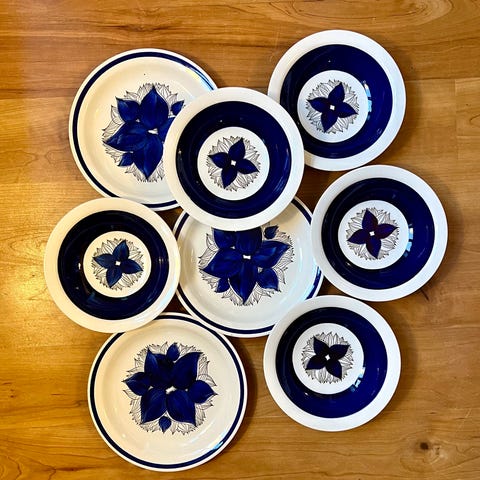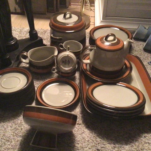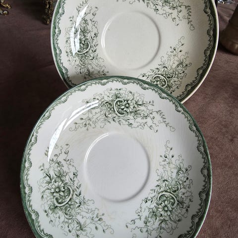 Et utvalg av forskjellige servisedeler fra svenske Rørstrand, alt fra serien Grønn Anna. Alle deler brukte, men få deler har noe særlig bruksspor, annet med noen få deler. En dyp tallerken har et lite nag på undersiden. Se nummer under bildene, og beskrivelse og priser nedenunder.