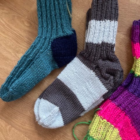 De gule str 27/28. De hvite str 25. De brune str 27/28. De blå/beige str 29. De flerfarget str 27/28. Strikker i garnet kos. (62%baby alpakka,9%ull,29% nylon). Selges kr 115 pr par. Eller samlet kr 500 pluss porto.