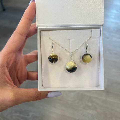 En nydelig sett i gave eske. En flott gave til seg selv eller noen du er glad i. Ekte baltisk Amber. Opprinnelsesland- Latvia.