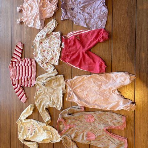 Klespakke til jente med 20 plagg str 62 fra Name it, Newbie, Lidex, HM, Hust og Claire mm. Pent brukt av ett barn, kan være noen små nupper på et enkelte plagg, litt slitasje på rygg på en sparkedress (se bilde), ellers i god stand.
