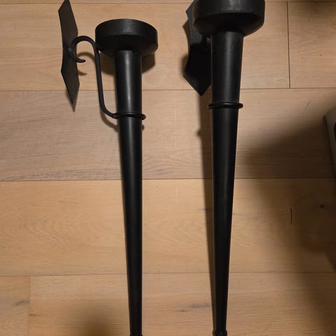 Lysestakene er av merke «Trompet», er av klart glass. De er 38 cm høye.