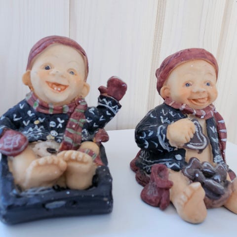 Flott julepynt fra Figaro, håndlaget norsk design keramikk. Skjønn liggende jente med strikket genser og vinterantrekk og lite liggende barn under dyne. Brukt, men ingen feil eller mangler. Kr 70 for jenta kr 35 for barn under dyne. Kan sendes evt avtale overlev Oslo. 🍃🌼🍃Dyr og røykfritt hjem