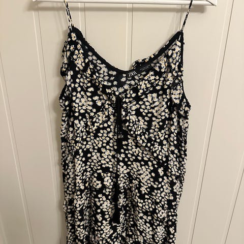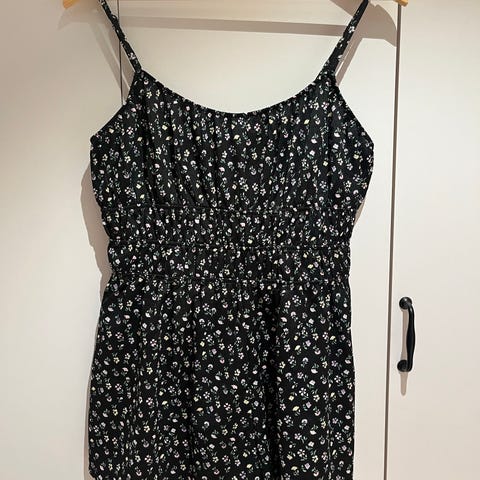 Supersøt minikjole i 90-tallsstil. Sort viskose med beige blomstermønster. Str 42 (normal i størrelsen). Ubrukt, men uten lapp.