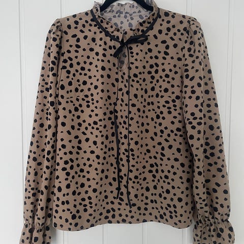 Blusen er fra H&M, har volanger på skuldrene og ermene. Et nydelig stoff som faller fint, knapp bak. Str 44, men ikke stor i str.
