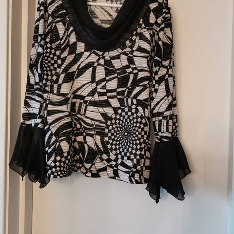 Bluse i crepet stoff med rutsje kant i hals og ermer, som er trompeformet.