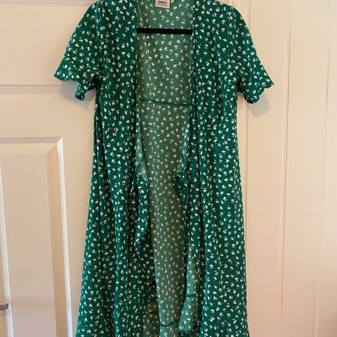 Lett omslagskjole i grønn med hvite prikker. Trekvart armer, rysje nederst. Fin sommerkjole fra Vero Moda.