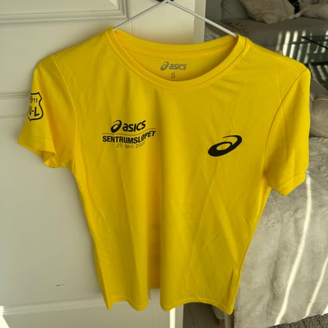 Selger en trenings t-skjorte fra Asics i størrelse S. Den har noen merker i stoffet som vist på bilde tre og fire, som ikke syns noe særlig. Asics-merket syns ikke lenger. Selges ettersom den ikke blir brukt.